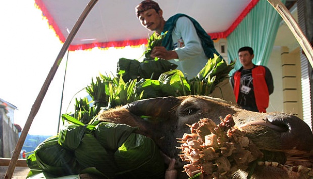 Saat upacara ini, sehari sebelum dimulai masyarakat Tengger menyembelih seekor kerbau yang dijadikan sesaji, hewan tersebut dipilih karena selain merupakan kendaraan Bethara Yama juga dianggap memiliki karakter agung, kuat dan sangat bermanfaat. Kepala kerbau akan diberikan kepada dewa penjaga gunung berapi, penjaga air, dan butho yang berada di luar dusun.